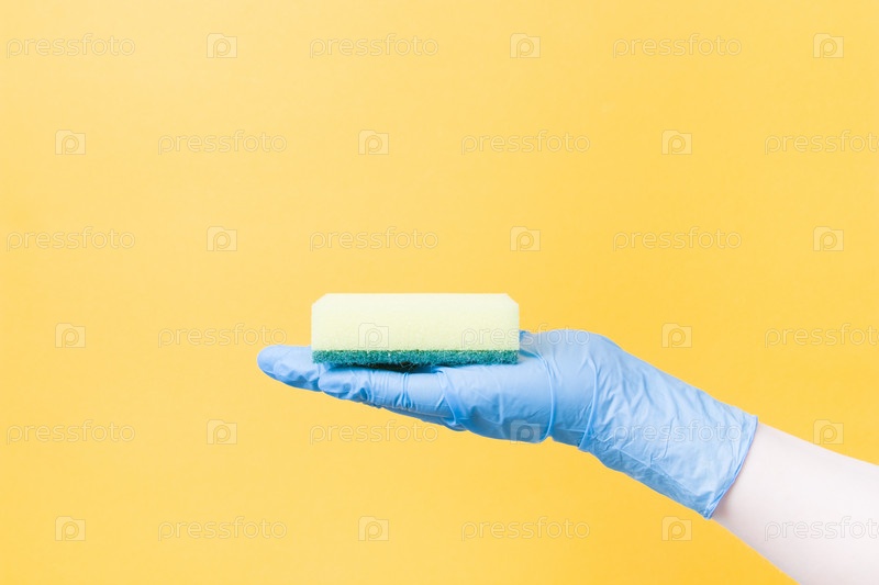Рука в синей одноразовой резиновой перчатке держит на ладони желтую паралоновую губку, пространство для копирования на желтом фоне, концепция уборки, домашние дела, весенняя уборка