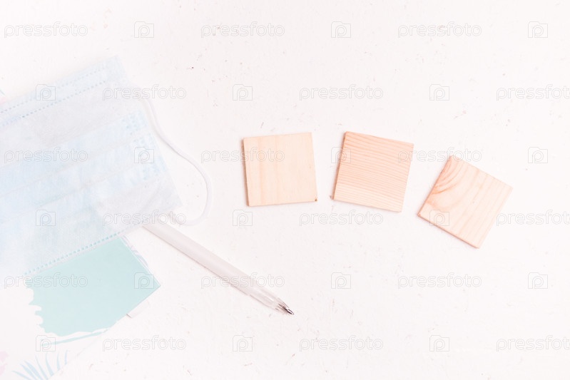 Блокнот и медицинская защитная маска на белом фоне, место для копирования, работа над надписью, концепция удаленной работы