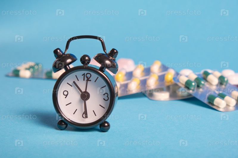 Упаковка таблеток и пилюль на столе с часами посередине. Лекарственное средство