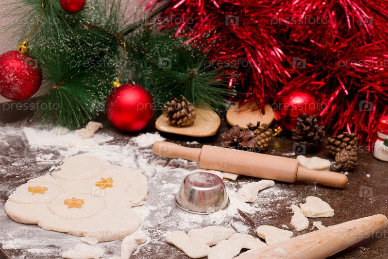 Изготовление рождественского печенья, деревянная кухонная утварь, красные елочные украшения, тесто для выпечки, форма для печенья