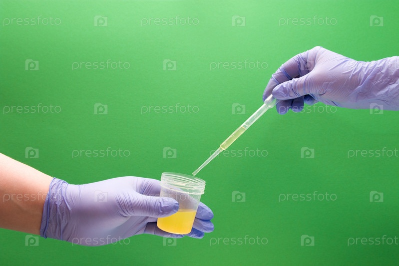Рука с пипеткой и рука с банкой для анализа, руки в одноразовых медицинских перчатках, зеленый фон, пространство для копирования, капать из пипетки в банку, набирать мочу в пипетку