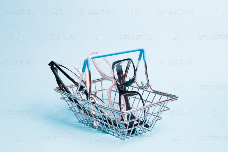 Несколько очков в игрушечной металлической корзине на голубом фоне, очки для взрослых и детей, покупка очков в магазине оптики