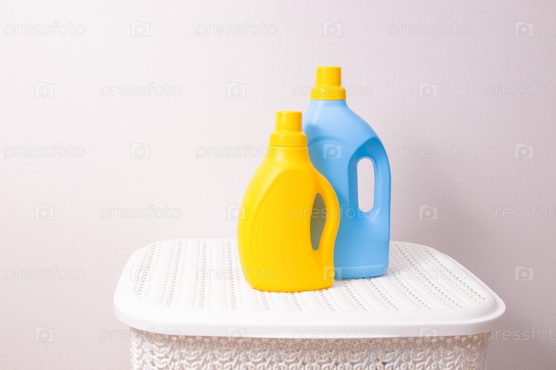 Гели для стирки в желтых и синих бутылках на белой пластиковой корзине для грязного белья, пространство для копирования, светлый фон, концепция стирки цветной и детской одежды