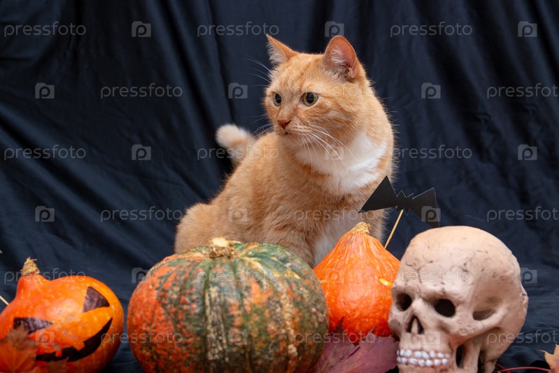 Рыжий кот с хэллоуинскими тыквами и осенними листьями, череп на темном фоне, вид спереди