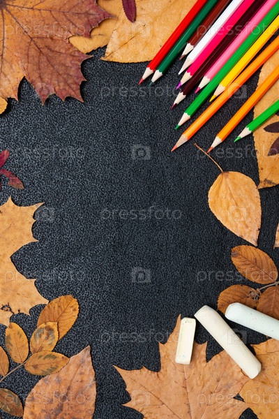 Сухие осенние желтые листья, цветные карнади и мел на черном фоне, копия пространства, плоская планировка, вид сверху, краска осенних цветов, осенний красный цвет