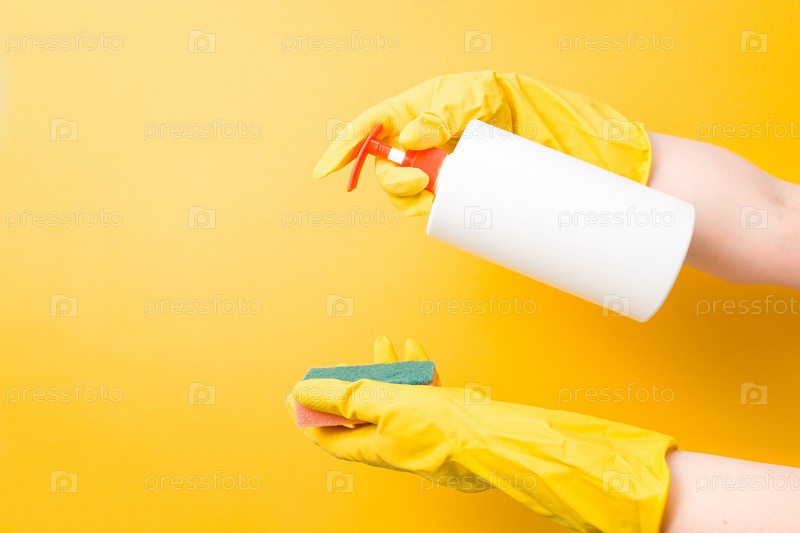 Женские руки в желтых резиновых перчатках держат дозатор мыла и губку для мытья посуды и уборки, желтый фон, пространство для копирования, весенняя уборка, мытье посуды, кухня и ванная комната