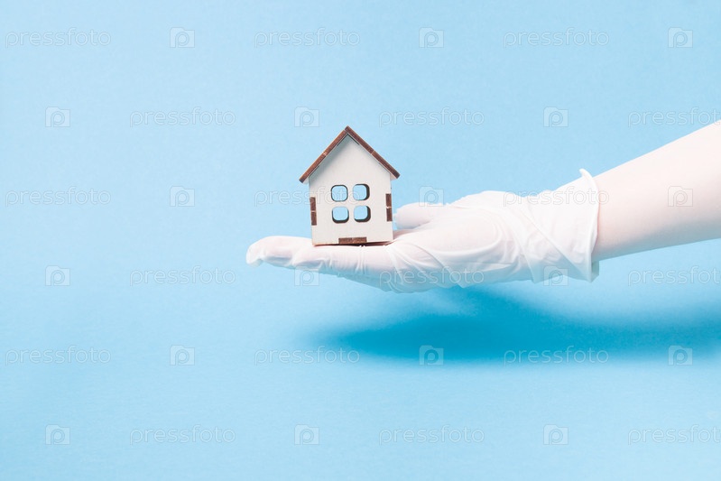 Маленький деревянный дом на ладони с белой медицинской резиновой перчаткой, синий фон, деревянная модель дома, концепция карантина, пандемия коронавируса, медицина во время эпидемии