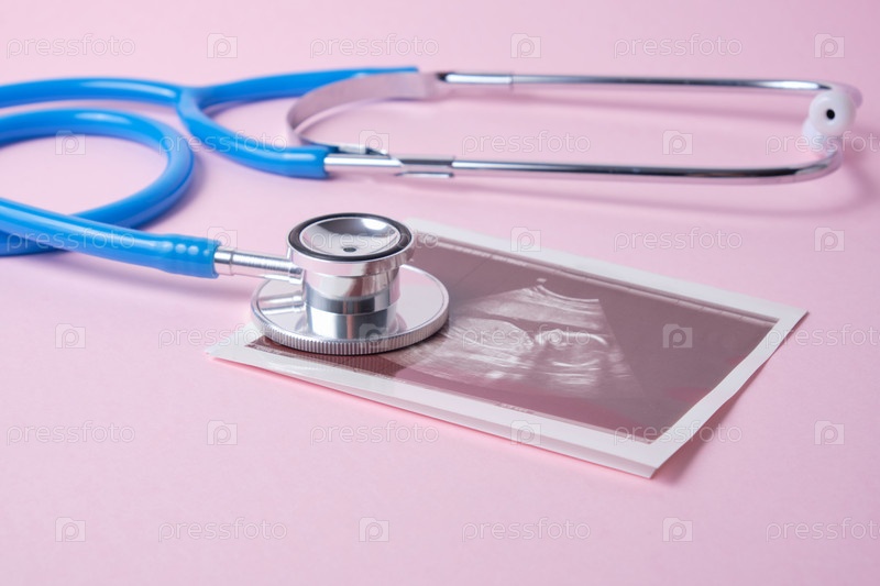 Медицинский стетоскоп и изображение эмбриона на розовом фоне