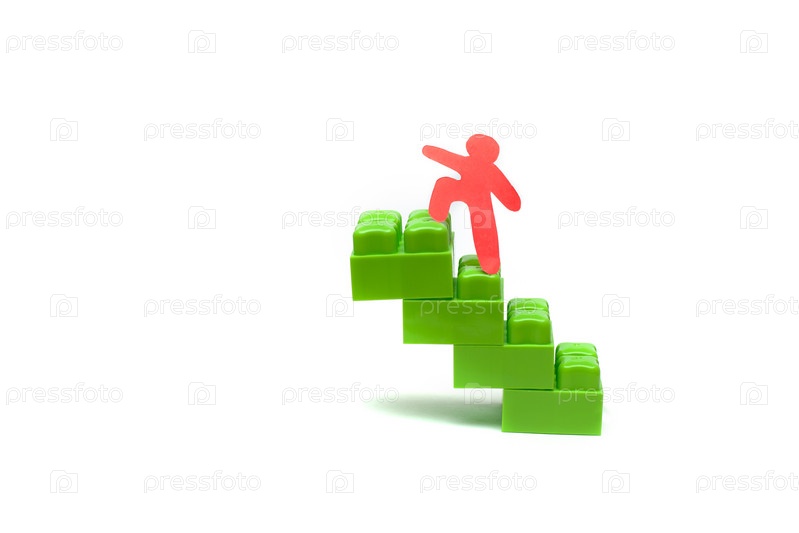 Красный бумажный человечек идет наверх от конструктора зеленого цвета изолированы
