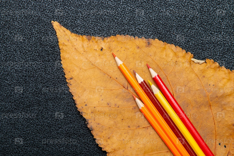 Цветные карандаши красный желтый красный оранжевый на сухом осеннем листе на черном фоне осенние цвета вид сверху копией пространства