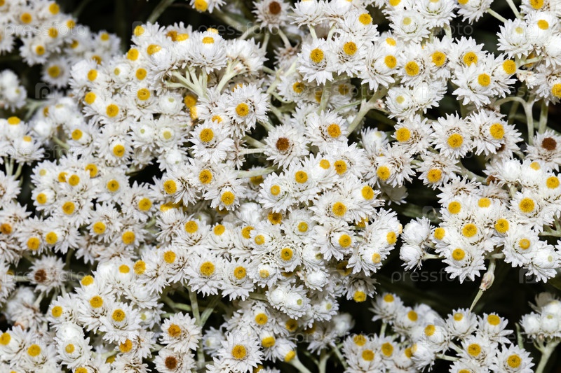 Anaphalis triplinervis или жемчужинный вечный фон с множеством белых цветов. крупным планом