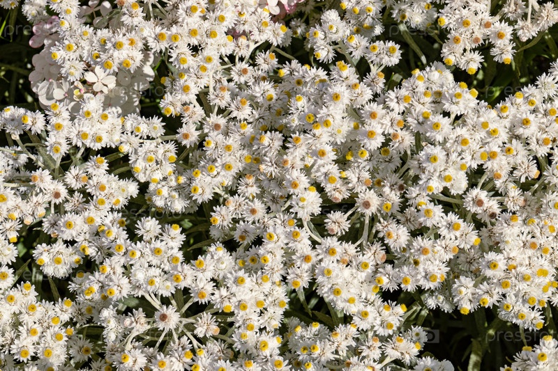 Anaphalis triplinervis или жемчужинный вечный фон с множеством белых цветов. крупным планом