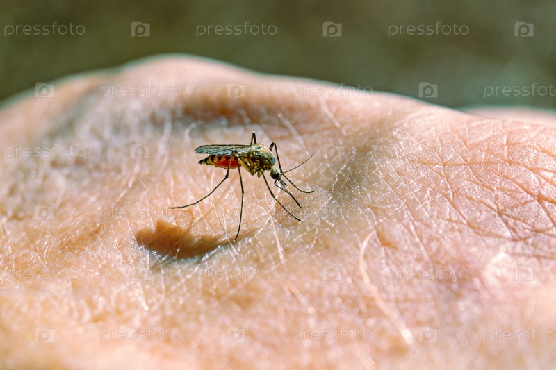 Комар садится на кожу человека, чтобы сосать кровь. крупным планом