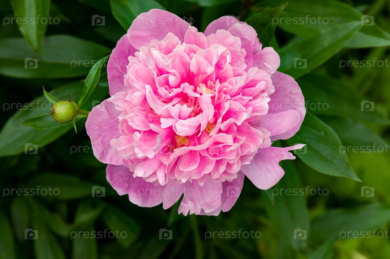 Розовый бутон пиона расцветает в цветущем саду. крупным планом