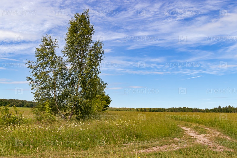Береза в поле с зеленой травой и полевыми цветами. Красивый фон природы. Летний пейзаж. Тульская область, Россия