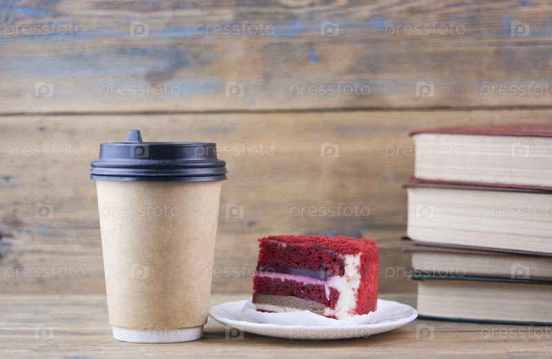 Красный бархатный сливочный сыр с черным кофе в бумажной чашке, деревянный фон
