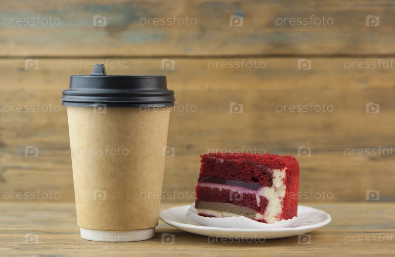 Красный бархатный сливочный сыр с черным кофе в бумажной чашке, деревянный фон