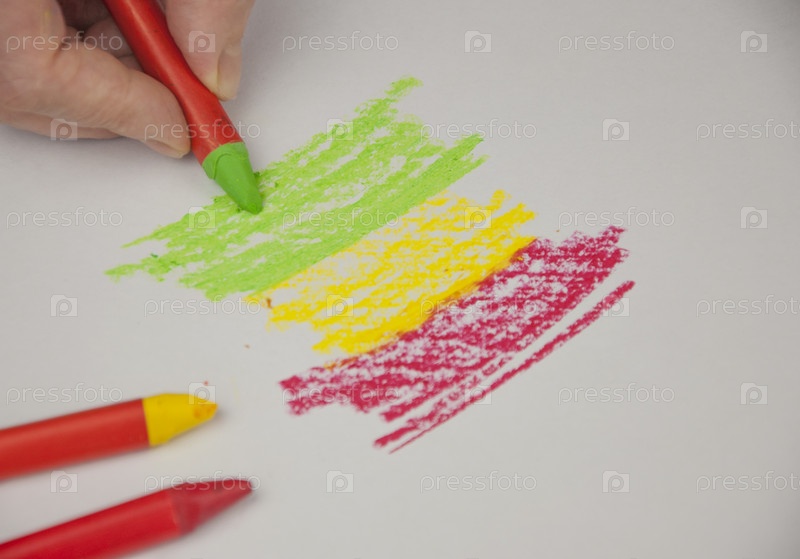 Женская рука держит красочную масляную пастель на белой бумаге