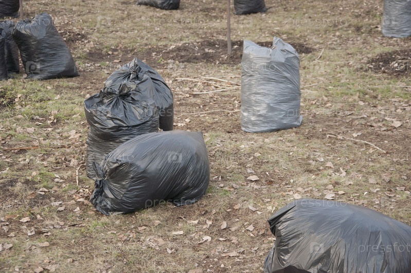Черные мешки, наполненные осенними листьями в парке. Уборка городского парка от опавших листьев