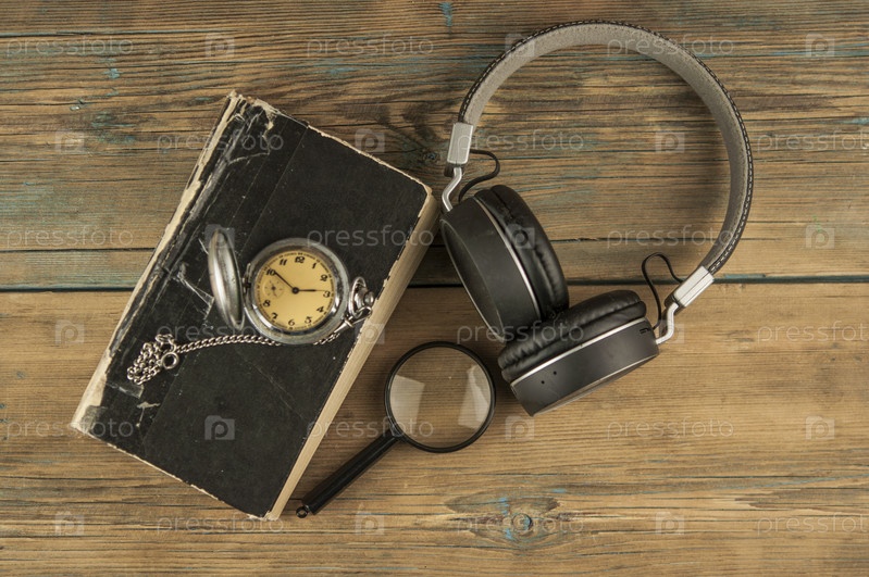 Книга и наушники на деревянном фоне. концепция аудиокниги