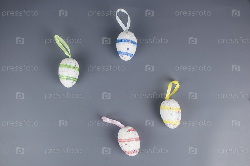 Счастливой Пасхи! Красочные пасхальные яйца на сером фоне. Поздравления и подарки на Пасху празднуют время. Плоская планировка, вид сверху