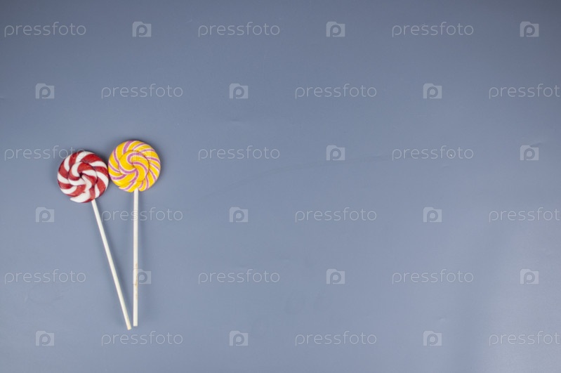 Минимальная концепция леденца на палочке. Два красочных леденца на палочке лежат на сером фоне. Модный фотошаблон для баннера, плаката, паутины