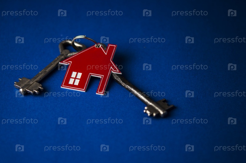 Расположение брелка в форме ключа и дома на синем фоне. Вид сверху, плоская планировка. Недвижимость, концепция страхования, ипотека, покупка дома, концепция риэлтора