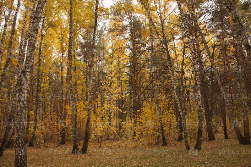 Осенний пейзаж. Красивая сцена с березами в желтом осеннем березовом лесу в октябре среди других берез в березовой роще