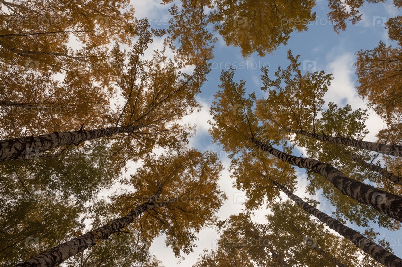 Осенний лесной фон. Яркое цветное дерево, красно-оранжевая листва в осеннем парке. Сцена смены природы. Желтые листья в сезоне октября Солнце в голубом небе