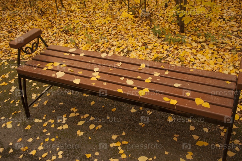 Желтый лист упал на садовую скамейку