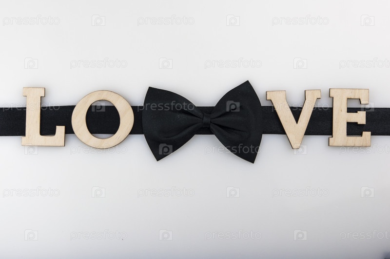Шляпка-бабочка из черной ленты со словом LOVE на белом фоне