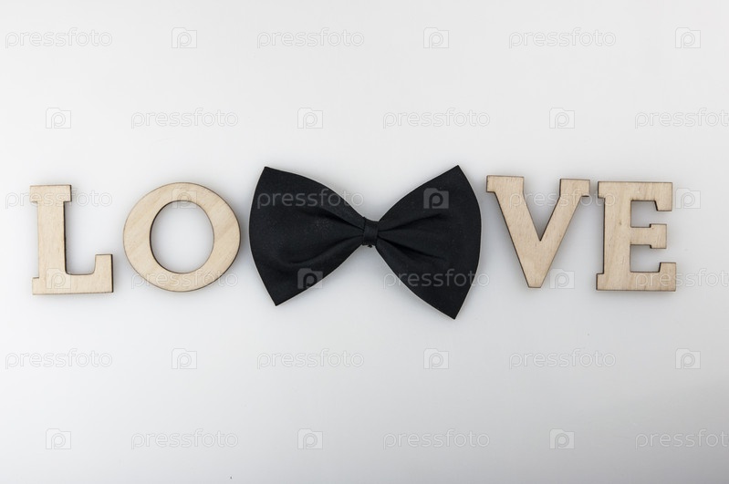 Шляпка-бабочка из черной ленты со словом LOVE на белом фоне