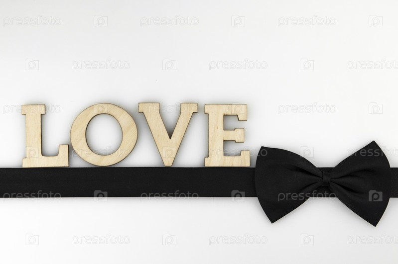 Шляпка-бабочка из черной ленты со словом LOVE на белом фоне