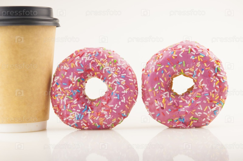 Вкусные пончики с одноразовой чашкой кофе на белом фоне