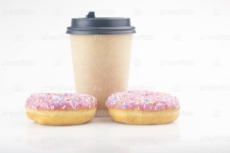 Вкусные пончики с одноразовой чашкой кофе на белом фоне