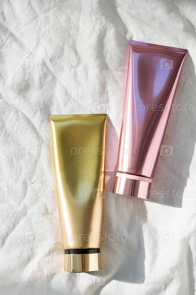 Смоделируйте сверкающие косметические тюбики на белом текстильном фоне. Коллекция бальзамов по уходу за кожей или лосьонов для тела