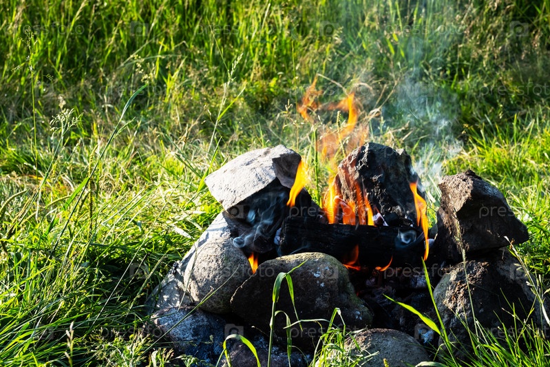 Костер горит в лесу. Туристический костер для приготовления пищи на природе
