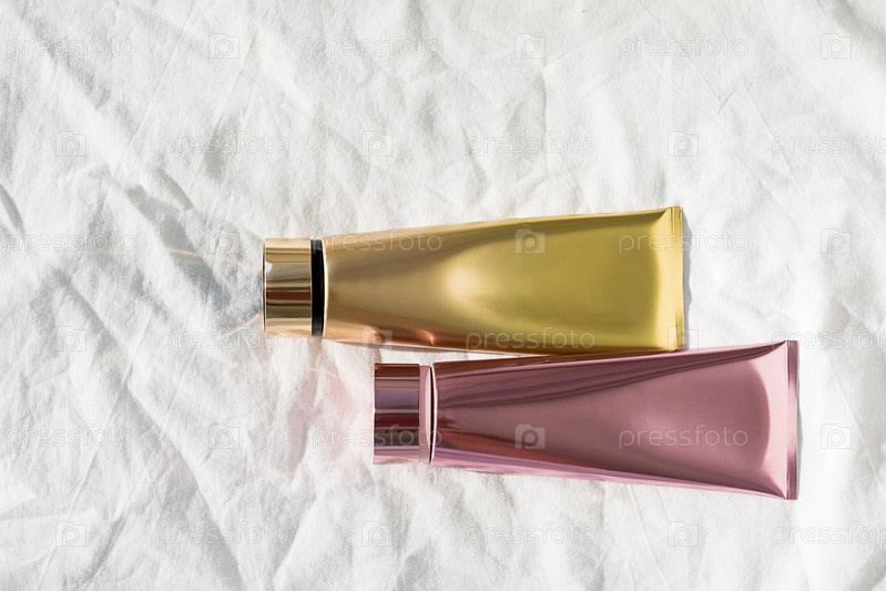 Смоделируйте сверкающие косметические тюбики на белом текстильном фоне. Коллекция бальзамов по уходу за кожей или лосьонов для тела