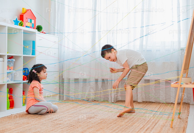 Маленькая девочка, мальчик, брат, братья и сестры, друг карабкается по веревочной паутине, игровой квест с препятствиями в помещении