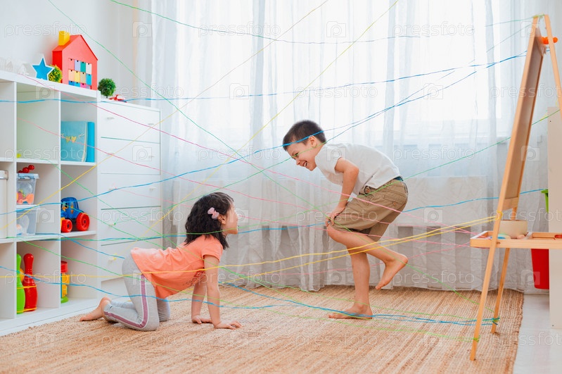 Маленькая девочка, мальчик, брат, братья и сестры, друг карабкается по веревочной паутине, игровой квест с препятствиями в помещении