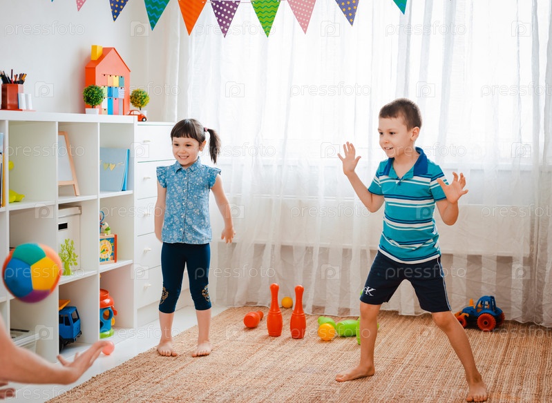 Родные дети мальчик и девочка играют в детской игровой комнате, бросая мяч. Концепция взаимодействия малышей, общение, взаимная игра, карантин, самоизоляция дома