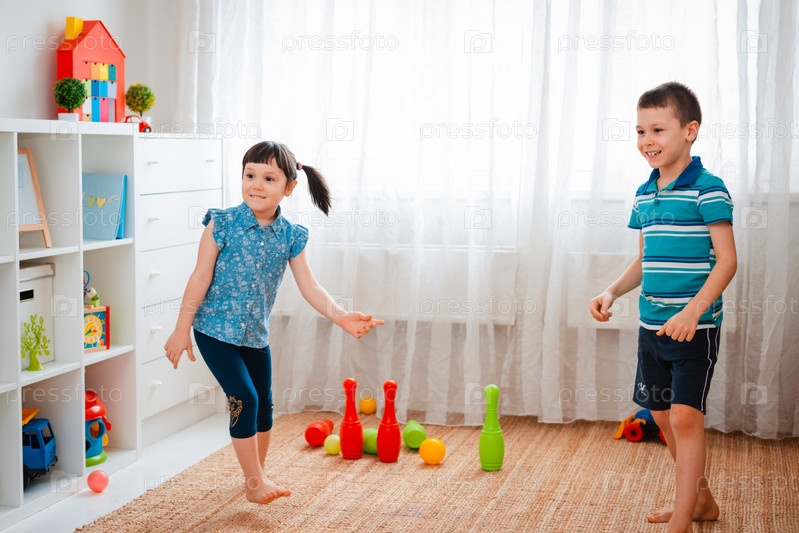 Родные дети мальчик и девочка играют в детской игровой комнате, бросая мяч. Концепция взаимодействия малышей, общение, взаимная игра, карантин, самоизоляция дома