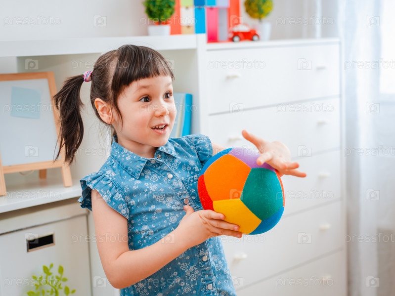 Дети маленькая девочка играет в детской игровой комнате, бросая мяч. концепция взаимодействия родителей и детей