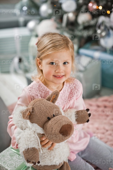 Девушка сидит возле елки и обнимает куклу-волка