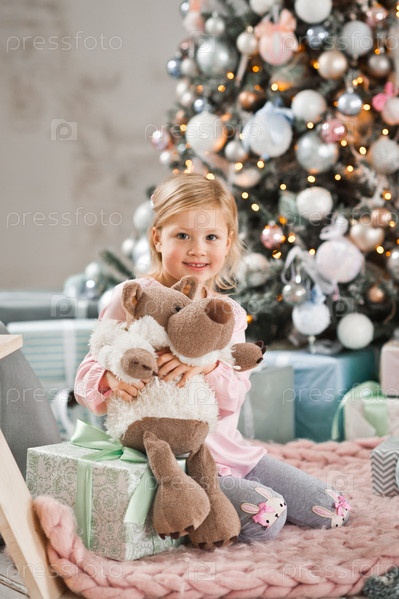 Девушка сидит возле елки и обнимает куклу-волка в шкуре