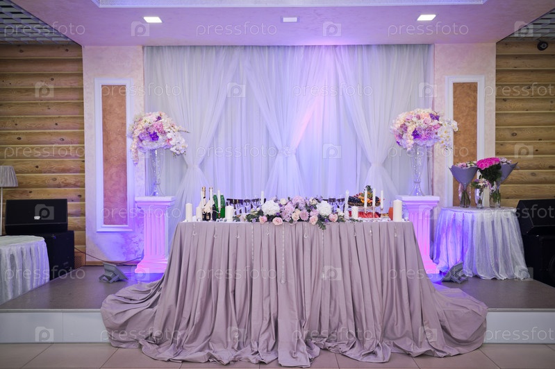 Торжественный зал со столами, накрытыми праздничными угощениями