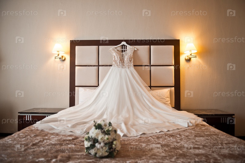 Великолепное свадебное платье невесты красиво разложено на кровати