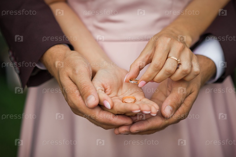 Жених и невеста держат на ладонях золотые обручальные кольца