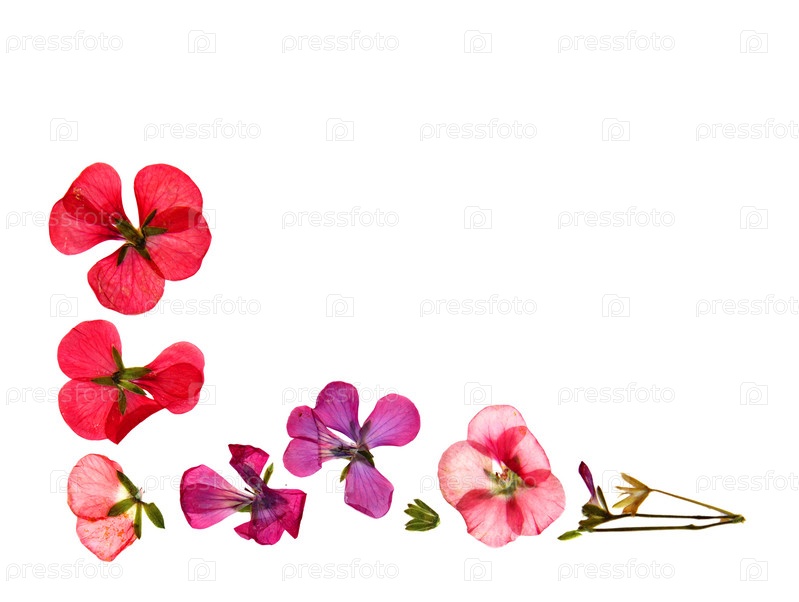 Прессованная многоцветная герань задает перспективу. Сухие нежные изолированные цветы и лепестки пеларгонии
