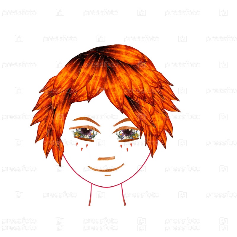 Аппликация, лицо из высушенных прессованных многоцветных цветков водосбора, длинный жесткий коричневый ирис